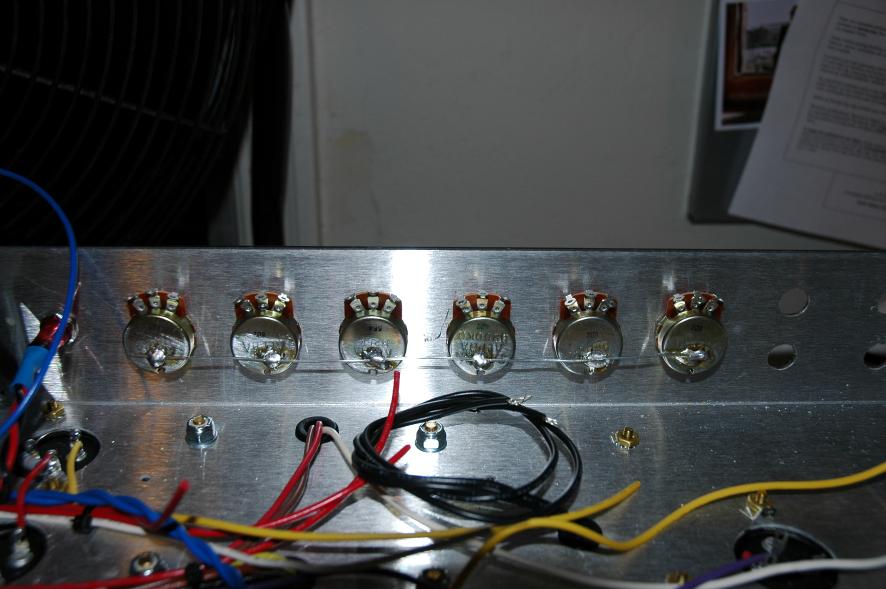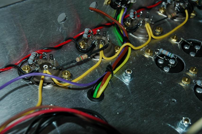 Text Box: Wiring the heaters is almost always one of the first jobs in any amp.  The leads should be twisted to eliminate the induction of hum in other parts of the circuit.    Here you can see the cap cans installed as well.