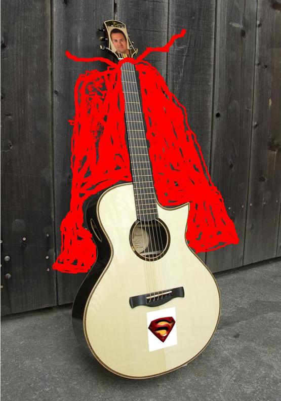 I approached Mike in 2012 about the idea of building a “bigger” Meridian, both in the physical sense and the bass response of the guitar.  My Meridian is a very touch responsive, expressive, and LOUD guitar, but its voice is thoroughly focused in the mid range.  With the “Super Meridian” I’m hoping to retain the volume and punchiness but add some bass response and girth.  I’ve also asked Mike to take the artistic signatures in a whole new direction.  (He has some of the nicest looking and most unique designs in the business, in my opinion.)