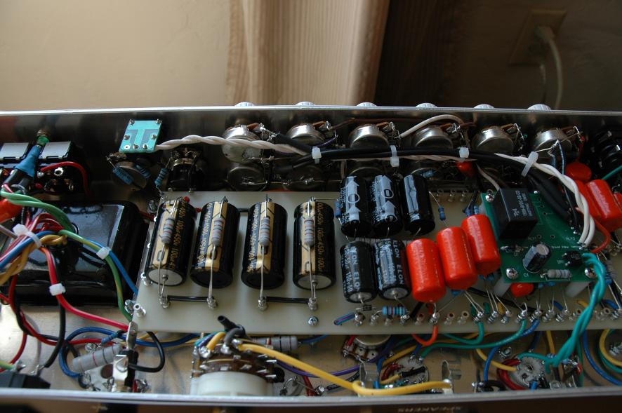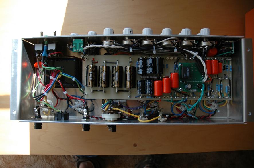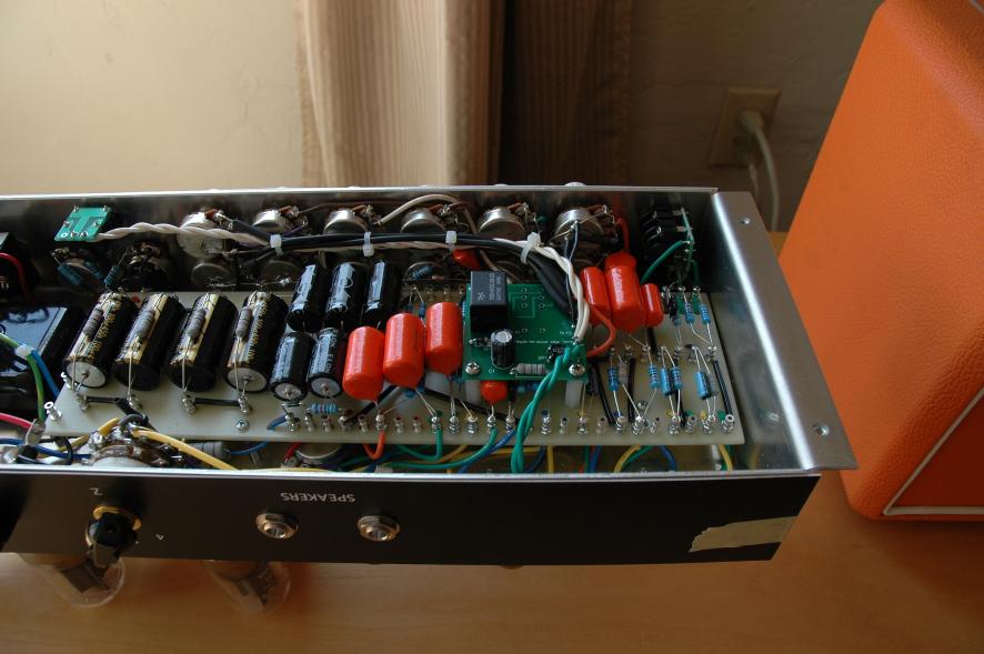 Text Box: And here is the completed board with the channel switching relay.  All the connections to the controls are made with shielded wire to reduce noise from this high-gain amp.  I don’t notice any significant effect on high end later.