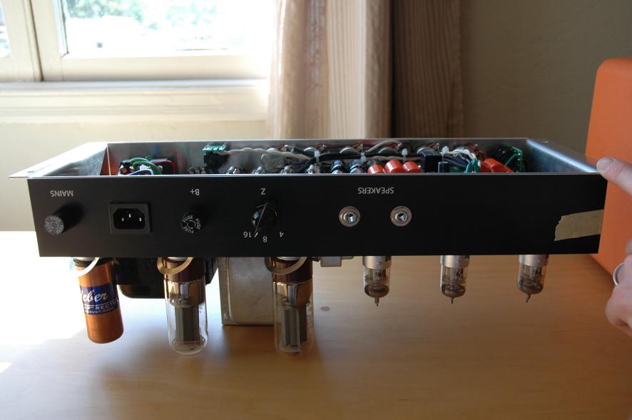 Text Box: Finally, here it is sitting atop my friend, Tom’s, Marshall cabinet, where it has been living happily for quite some time.  Tom’s happy to have boutique tone for the cost of the parts, and I’m just happy it works.  :-)