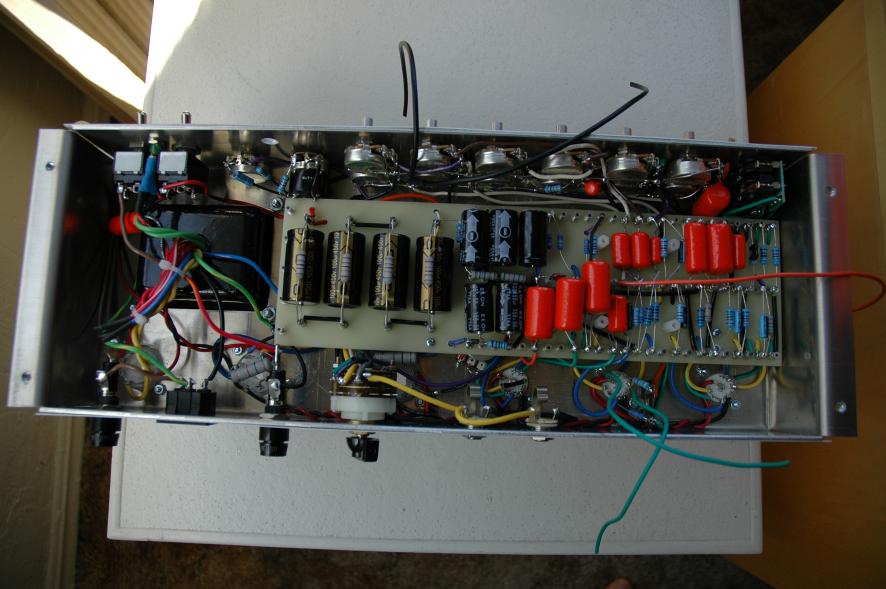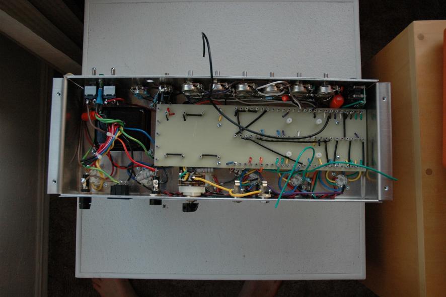 Text Box: I made the unfortunate mistake of choosing Sprague Orange Drops for my coupling caps.  Why?  Because they are huge.  They made an already tightly packed board even more difficult to load.  I also had to customize the standoffs for the channel switching relay to clear those big caps.  But it worked out in the end.