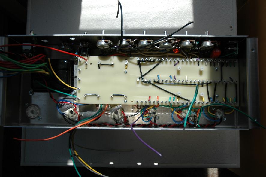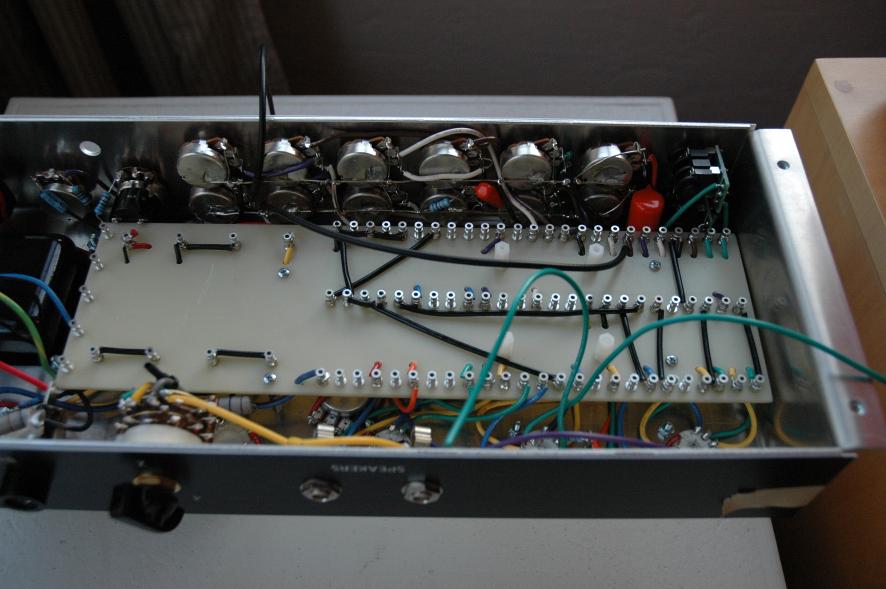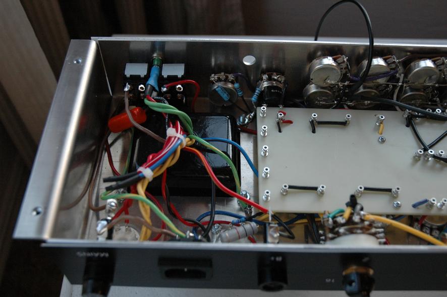 Text Box: Lots of progress here.  All of the power transformer connections are complete.  The impedance switch is installed, along with the output jacks, power socket, and fuses.  The board is now ready to be loaded with components.