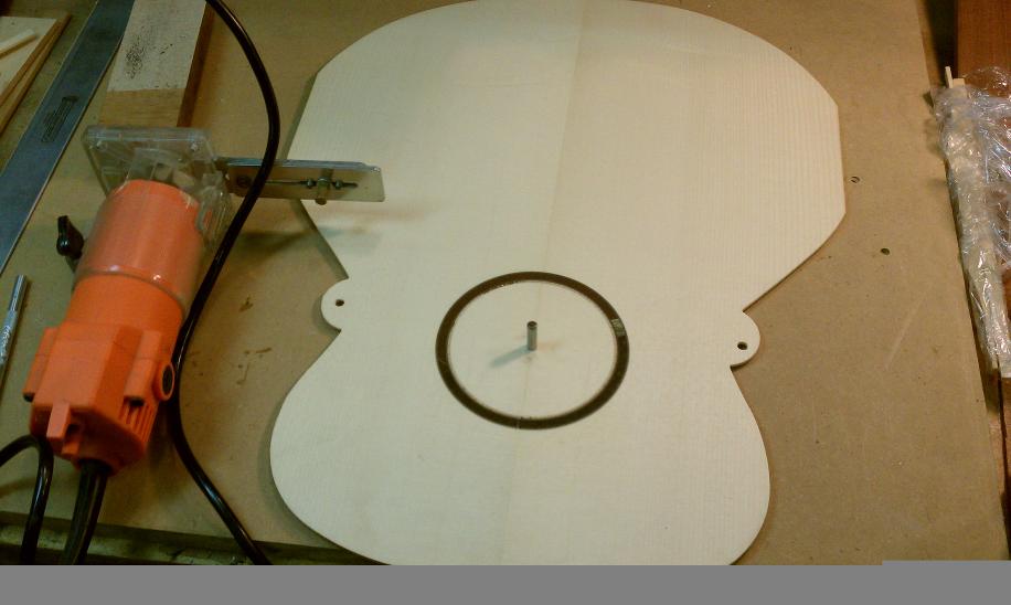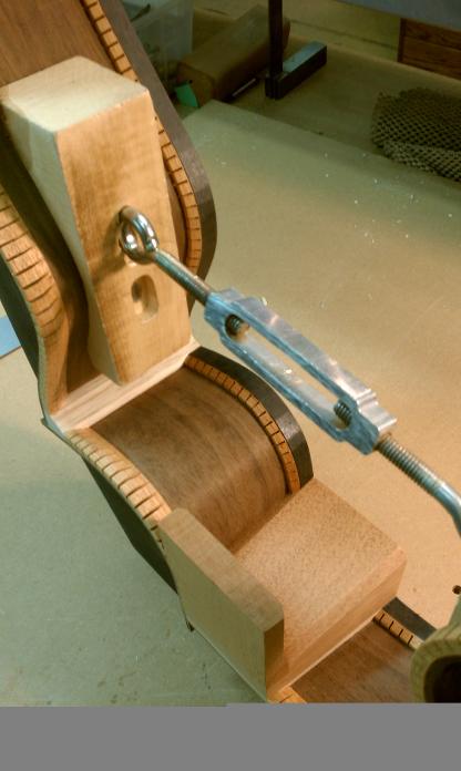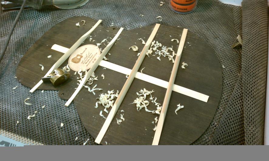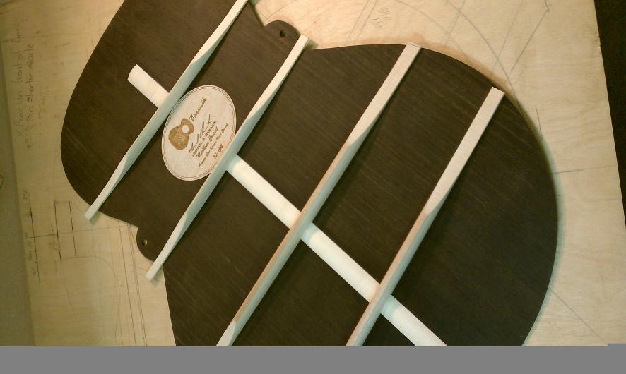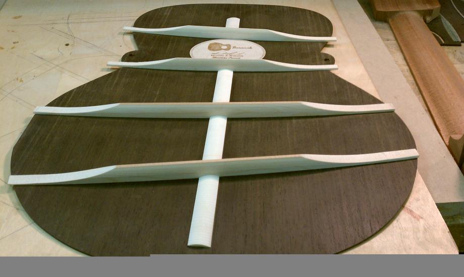 Text Box: These shots show the back bracing and final shaping, as well as the installation of the name plate and gluing of the back to the sides.  The sound hole can be seen prior to routing and braced top is also shown in the vacuum clamp.