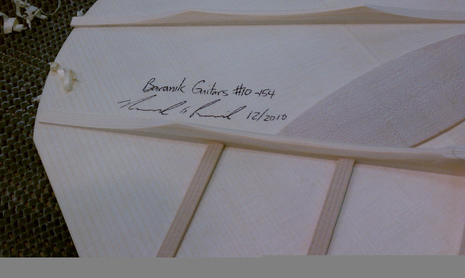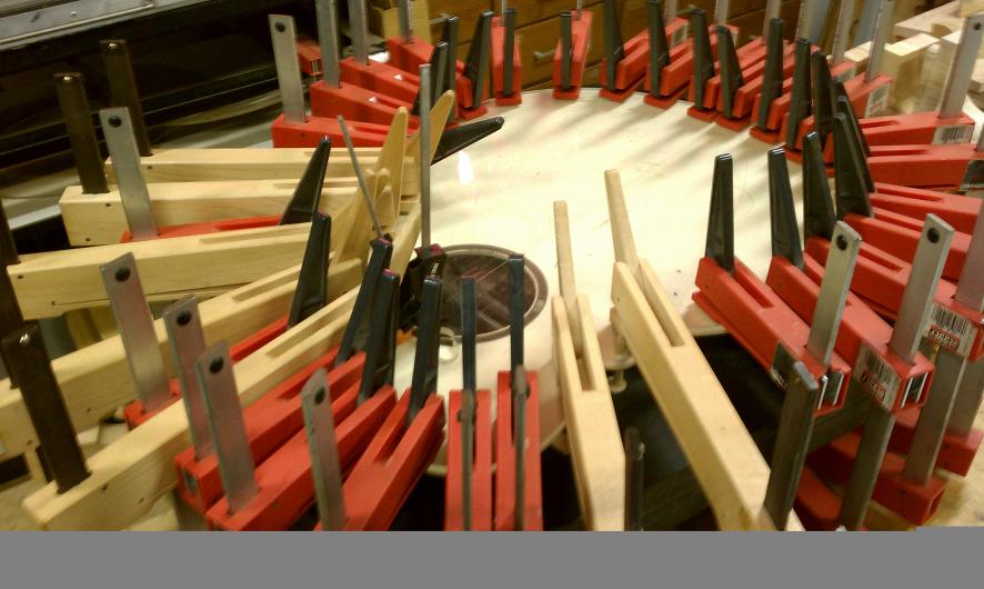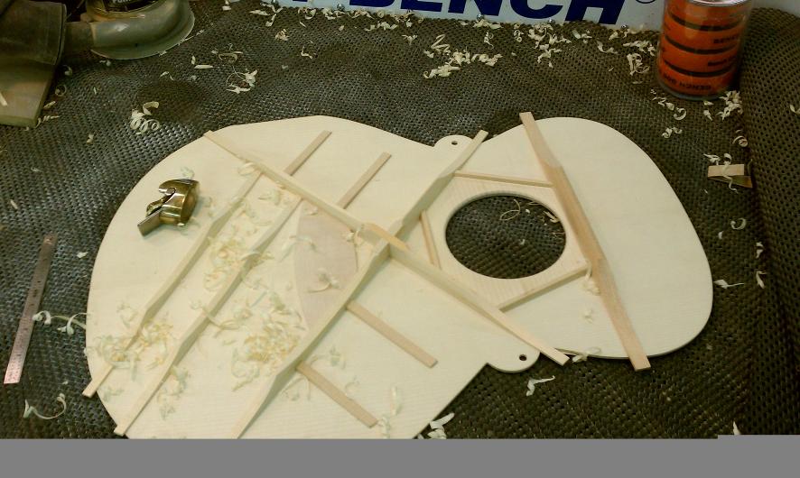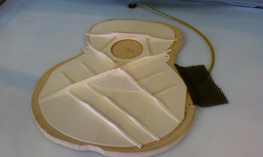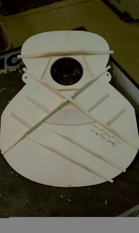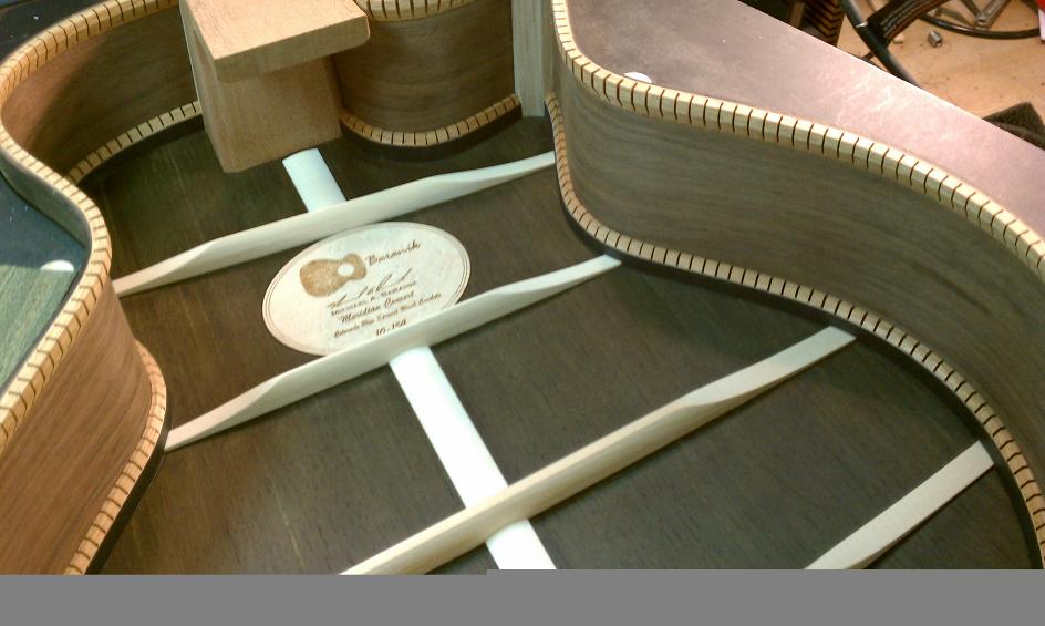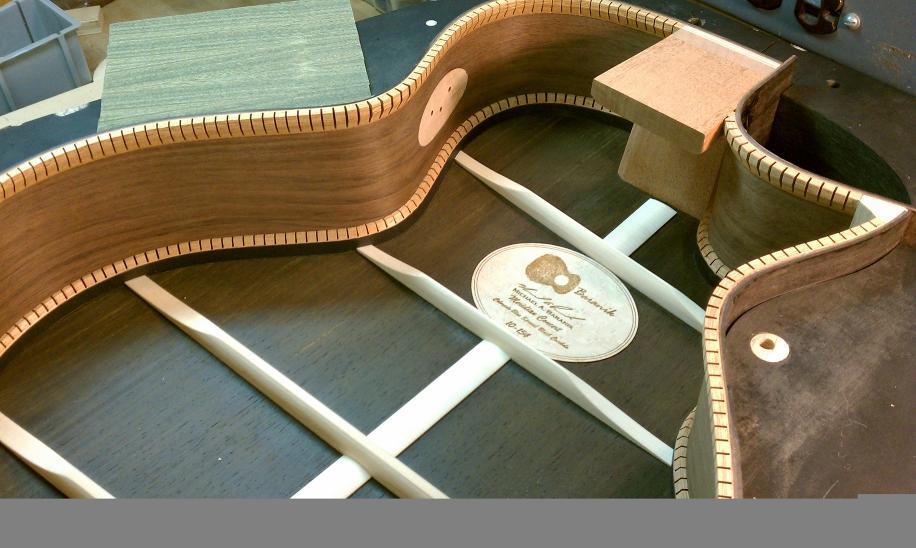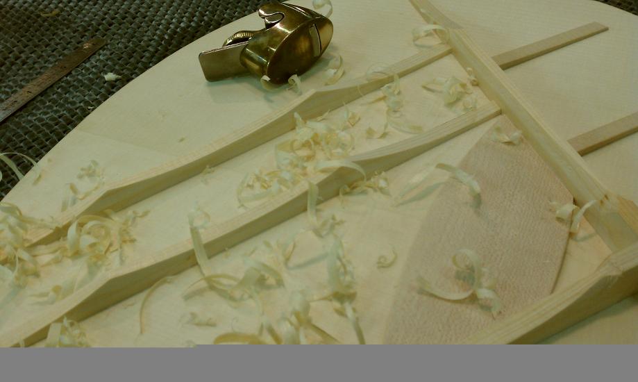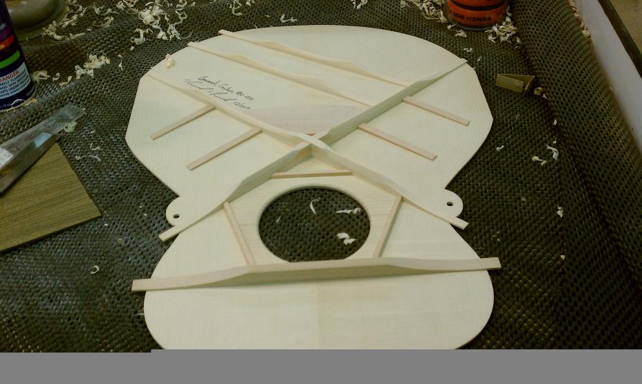 Text Box: The braces have been vacuum clamped to the top.  The tap tone of the top is altered by shaving the braces down.  And ultimately the top is glued to the rest of the body.
