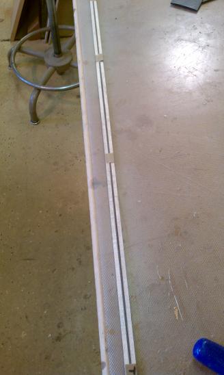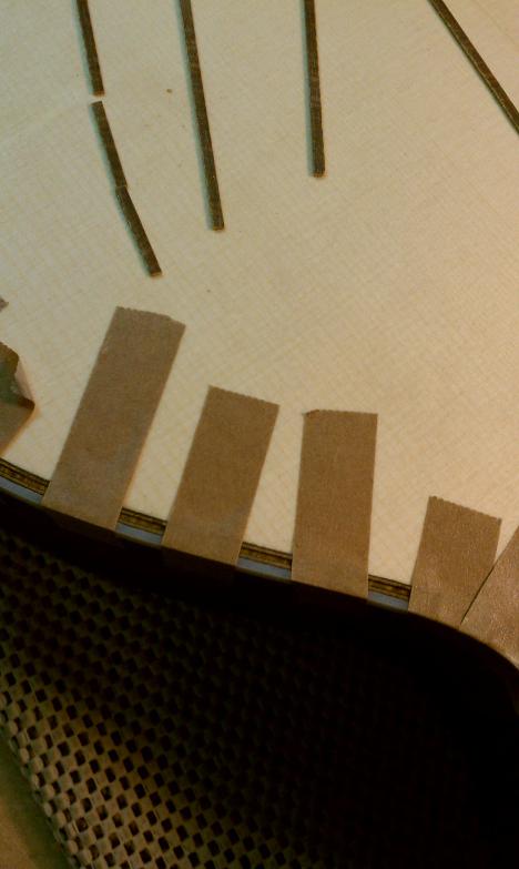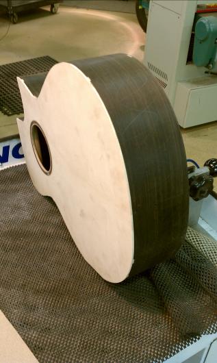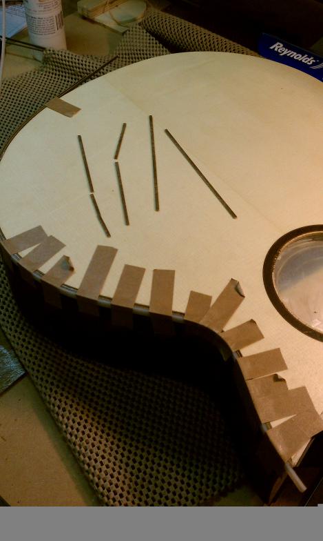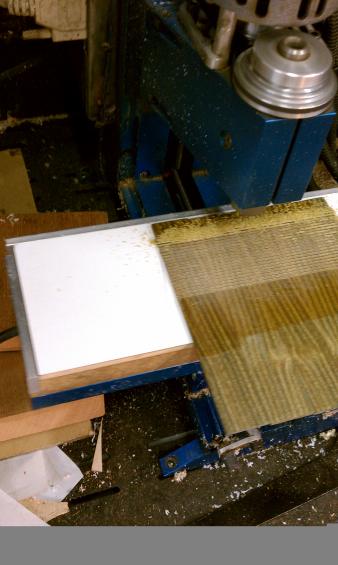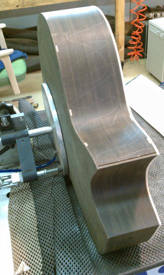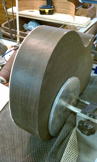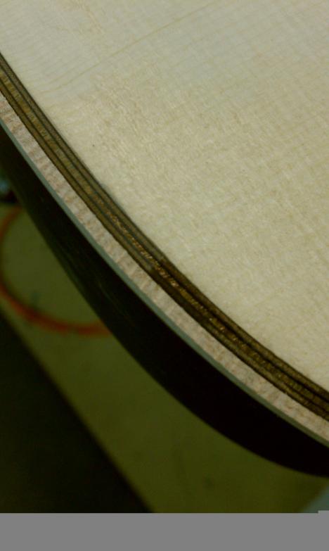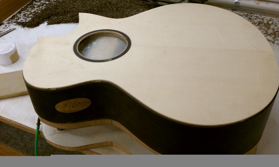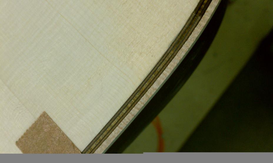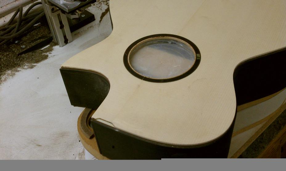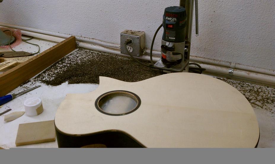 Text Box: The body having been closed up, it is now time to route the edges for purfling and binding.  Mike will be using spalted sap koa (almost like a flamed maple) for binding.  The top will have a fairly thick ring of purfling using cross-cut lignum vitae with an (as yet) unidentified wood on either side.