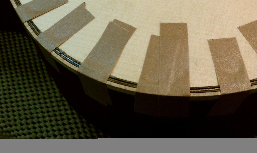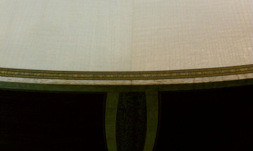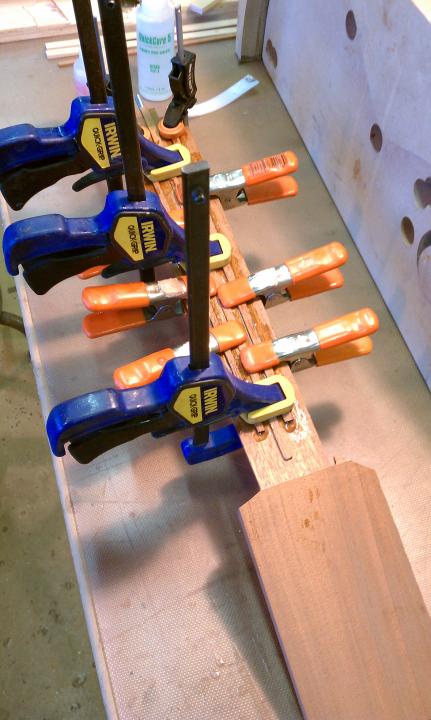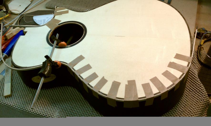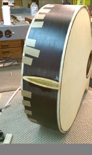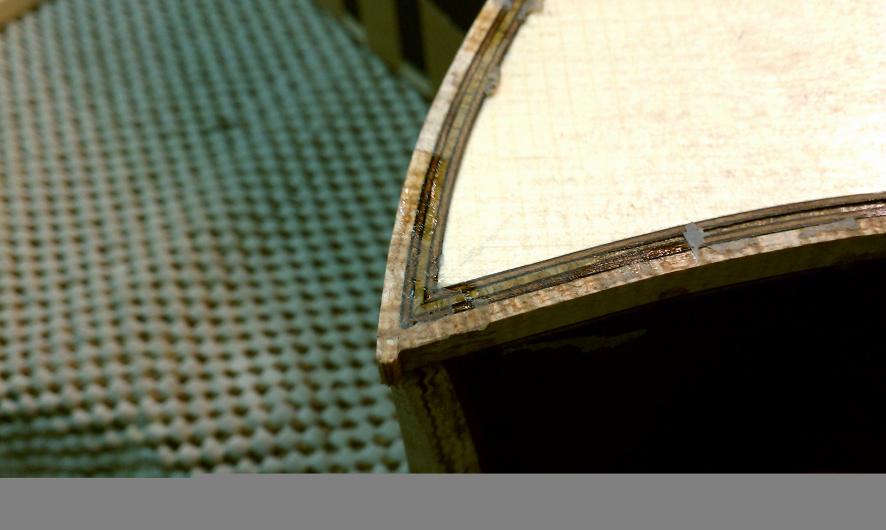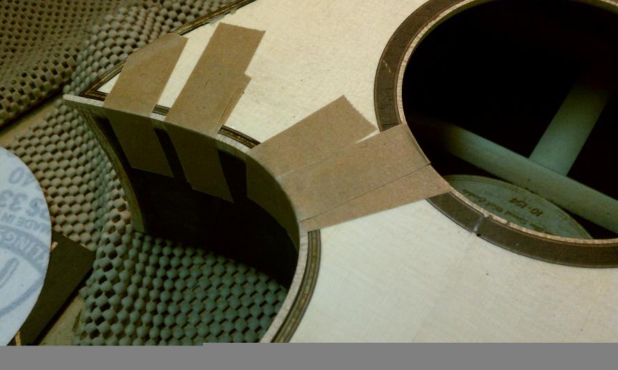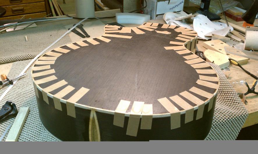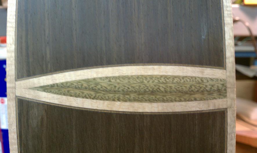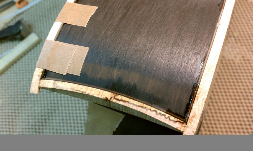 Text Box: Here you can see the installation of the binding.  Lignum vitae is used for the end wedge and (cross cut) for the top purfling.  The lignum vitae is surrounded on both sides by thin strips of ipe, which is used for purfling elsewhere on the guitar.  The flamed sap koa binding looks gorgeous.